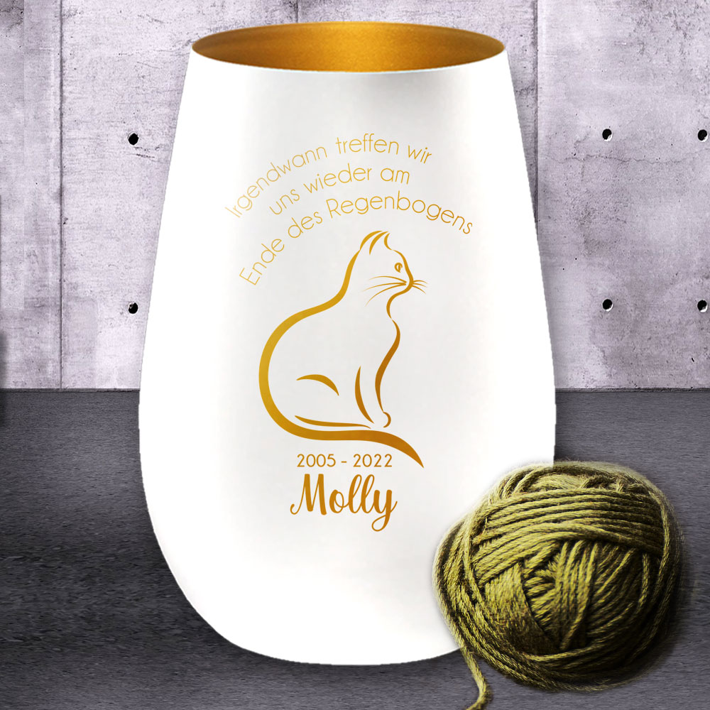 • Graviertes Trauerlicht für deine Katze mit Namen und Datum weiß gold